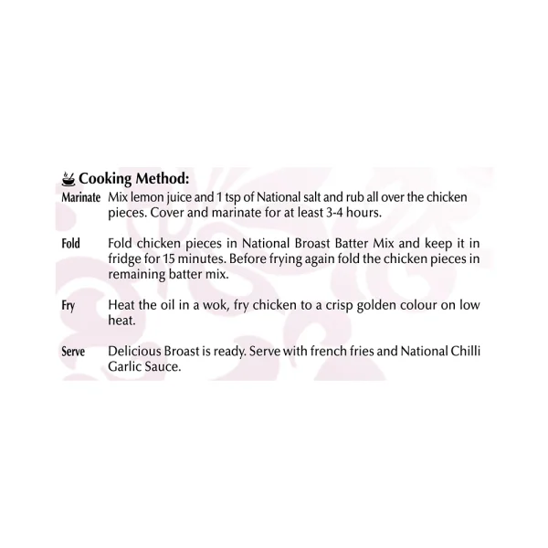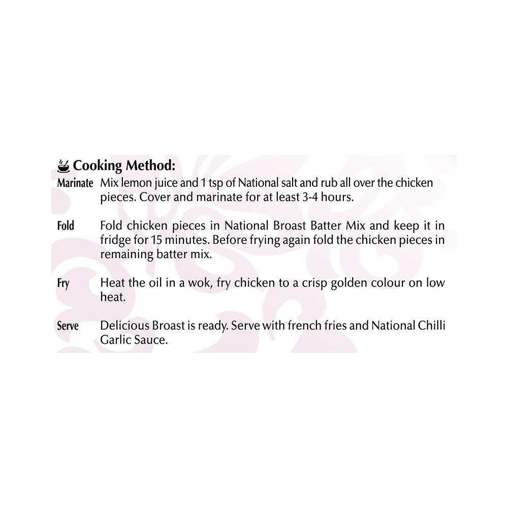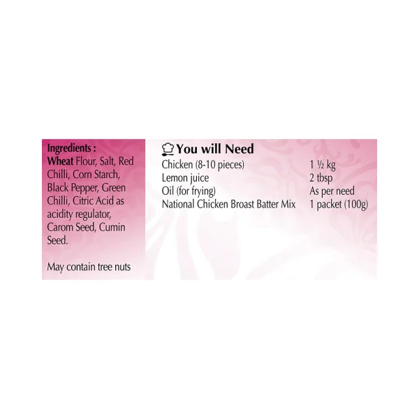 National Chicken Broast Batter Mix is for batter coated fried chicken is specially made by a panel of experts, using aromatic spices and the finest ingredients in exactly the right measure. It will enable you to cook delicious meals with ease that you and your loved ones can relish each day.